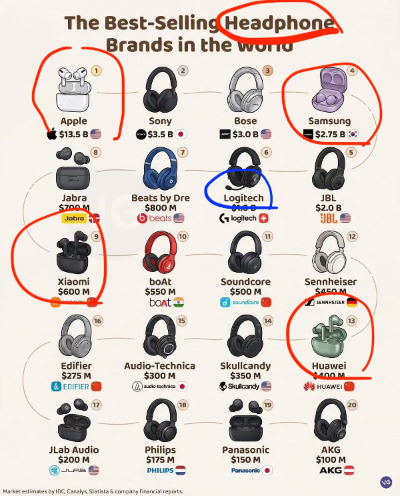 그것뿐이겠습니까? 이 글도 맥북에어로 쓰고 있고요. 핸드폰은 중국에 살던 기간을 제외하면 계속 애플만 쓰고 있습니다. 그러한 경미한 수준의 애플빠(?) 입장에서 더 신기한 것은 4위가 삼성이란 점입니다. 자연스럽게 샤오미와 화웨이에도 눈길이 갑니다. 그리고, 마우스 회사로 알고 있는 로지텍이 7위인 점도 눈에 띄는데요. 아이코닉한 그림에도 마이크가 붙은 것을 보면 게이머를 위한 기능과 브랜딩이 된 것이 아닌가 싶습니다.