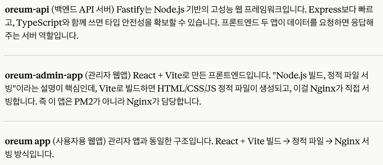 대답으로 받은 내용을 다시 클로드에 던져서 오름 앱 구성을 파악해 달라고 했더니 다음과 같이 풀어줍니다.