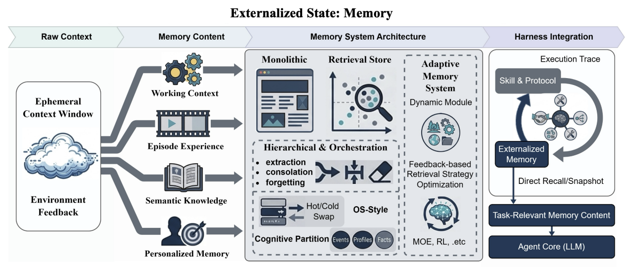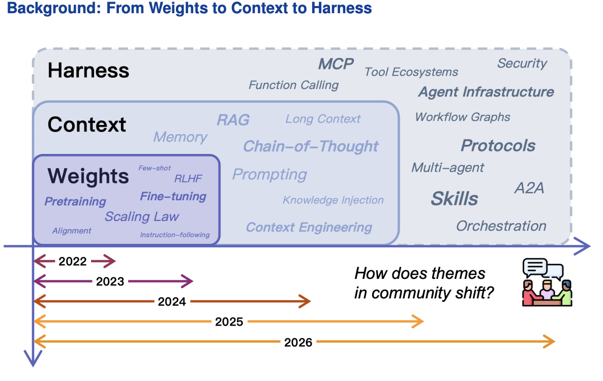 앞서 잠시 언급한 <Externalization in LLM Agents: A Unified Review of Memory, Skills, Protocols and Harness Engineering>라는 논문이 있습니다. 작년에 썼던 글 중에 <프롬프트 엔지니어링에서 컨텍스트 엔지니어링으로>가 있는데, 논문 수준에서 보인 기술이 클로드 코드 안에서 작동한다고 느낍니다. 논문에서도 기술 변화 추이를 도식화한 그림이 등장합니다.