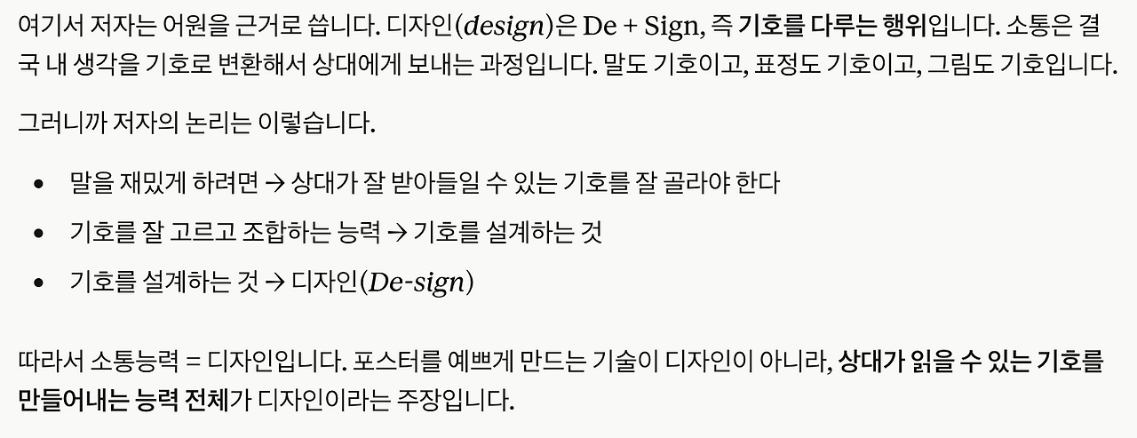 하지만, '소통능력이 바로 디자인이다'라는 말에는 고개를 갸웃하게 됩니다. 다시 클로드에게 저자 역할을 맡겼습니다.