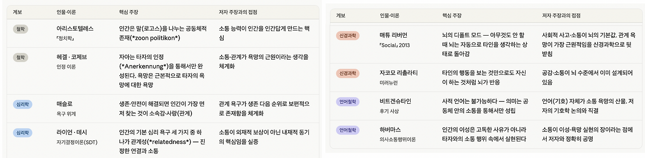 그런데, 욕망 중 가장 으뜸이 바로 소통이자 관계란 말은 뜻밖이었습니다. 그런 생각을 공유하는 사람들이 많은지 클로드에게 물었더니 많은 수준이 아니라 엄청난 계보가 이어져 온 생각이었습니다.
