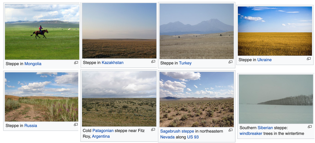 그리고 위키피디아에 나오는 스텝 사진을 모자이크처럼 모아 보면 책에서 읽은 내용들을 시각 이미지로 구현한 듯한 느낌을 주었다. 개인적으로는 가장 눈에 들어오는 사진은 두 개인데, 몽골 스텝의 말 달리는 사진 그리고 마치 우크라이나 깃발을 연상시키는 듯한 우크라이나 스텝 사진이다.