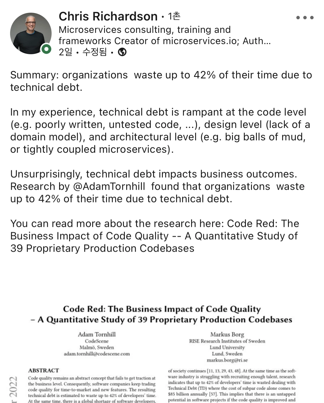 소프트웨어 시스템에 국한하여 정원관리를 방치하면 벌어지는 일을 흔히 기술부채(technical debt)라고 한다. Chris Richardson이 링크드인에 올린 글에 따르면 42%에 해당하는 시간이 기술부채에 따른 비용으로 들어가고 있다. 앞서 Kent Beck이 말한 가치 창출과 무관한 시간 말이다.