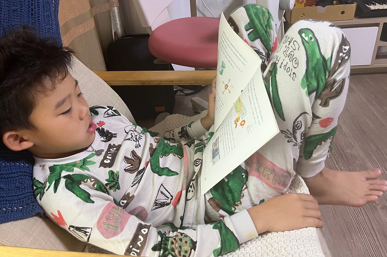 지난번 교훈으로 이번에는 유튜브 강의를 찾는 준비를 해서 아이와 만났다. 그런데 이번에는 아이가 유튜브는 안 본다고 선언했다. 그러면 아빠가 책을 읽어줄까 하고 물었더니 자기가 읽겠다는 것이다. (내 머릿속에서는 '모르는 말이 많을 텐데'라고 말하고 있었지만 ) 한발 물러서 그럼 읽고 궁금한 것을 물어보라고 말했다. 아이는 아래와 같은 모습으로 책을 읽었다.