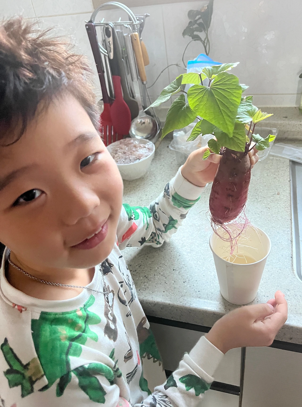 <주제는 그저 학습 여행에 이름을 붙일 뿐> 편을 쓰며 경험을 다졌던 시간은 나에게 당황하는 대신 다음에 나갈 길을 찾게 했다. 나는 책을 훑어보며 함께 다뤄볼 문제를 살피고 있었다. 아이가 요즘 돈 벌고[1] 쓰는 일을 하며 돈에 관심이 많은데, 단위에 쓰이는 0을 이용해 보면 좋겠다고 생각하고 있는데 아이가 키우고 있는 고구마로 향했다. 고구마를 바라보는 아이에게 관심을 갖다가 함께 떠날(?) 여행지를 찾았다.