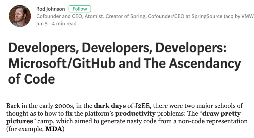 위 문장을 읽던 즈음에 <디지털 대전환기란 나에게 무엇인가?> 편을 쓰면서 4년 전에 발표했던 자료를 찾았습니다. 마침 거기서 발견한 아래 내용탓에 과거의 경험이 생생해졌습니다. UML 전문가(UML 교육과 활용으로 생업을 영위)이면서 동시에 Spring 개발자인 Rod Johnson 추종자[1]였던 저는 코드 보관소인 Github이 마이크로소프트에 매각될 때 그가 했던 말이 매우 인상적이었습니다.
