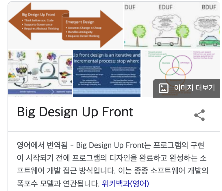 어떤 상황인지 이해할 수 있었지만, 단락의 제목이 '폭포수 모델 기반 설계'인 점이 어색했습니다. 개인적으로 폭포수 모델이라는 말을 자주 쓰지 않았던 탓에 설계 방식과 그 단어를 함께 쓰는 일이 낯설었습니다. 그래서 제가 익숙했던 표현인 ㅏUpfront design에 대해 (약 10년 만에) 구글링 해보니 요즘은 Big Design Up Front라고 하는 모양입니다.