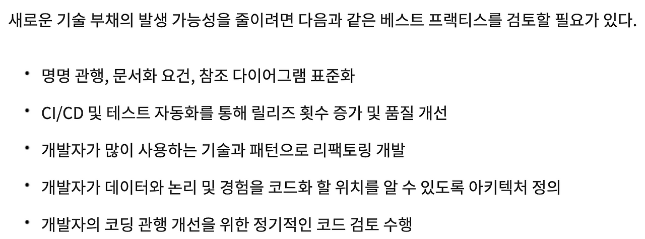 이에 대해 <코드 개선과 적절한 계획 및 측정이 기술 부채를 줄이는 지름길> 편은 의미 있는 체크 리스트를 제공합니다.