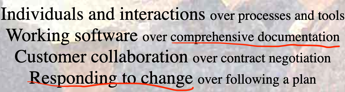 주객이 전도된 느낌이 들어 다시 한번 애자일 선언문을 소환하고 싶습니다. 차세대 발주사 입장에서 Customer collaboration은 앞으로 우리가 시스템을 운영하고 변경하는 방법을 암시합니다. 그리고 바러 윗줄에 나오는 선언문도 검수 단계와 연결해서 생각해볼 수 있습니다. 충분한 설계서(comprehensive documentation)가 검수 용도 말고 유용할까요? 설계서가 오픈 이후에 발생할 미래의 일들에 대처할 수 있는 시스템을 만드는 일보다 중요할까요?