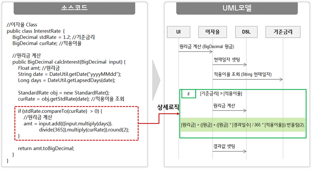 전에 제가 기고했던 글에서 보여드렸던 그림인데요. 같이 한번 보시죠. 동일한 로직을 왼쪽은 Java 언어로, 오른쪽은 UML 모델과 DSL로 작성한 것입니다. 어느 쪽이 이해하기 쉬우신가요?