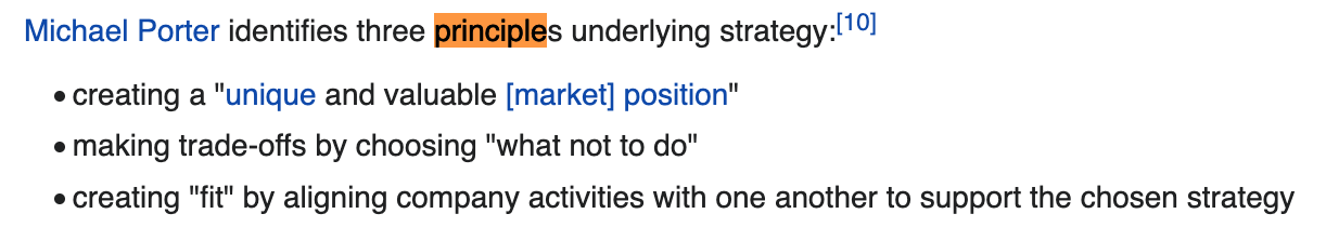 다시 한번 기사에서 설명하는 내용을 보편적인 틀로 이해하기 위해 위키피디아를 찾았다. 다만, 앞서 살펴본 대로 다양한 정의 중에서 주로 관심을 두는 Business strategy 페이지로 한정했다. 해당 페이지에 'principle' 단어가 등장하는지 검색했다. 주석을 제외하면 네 번 등장했다. 빙고!