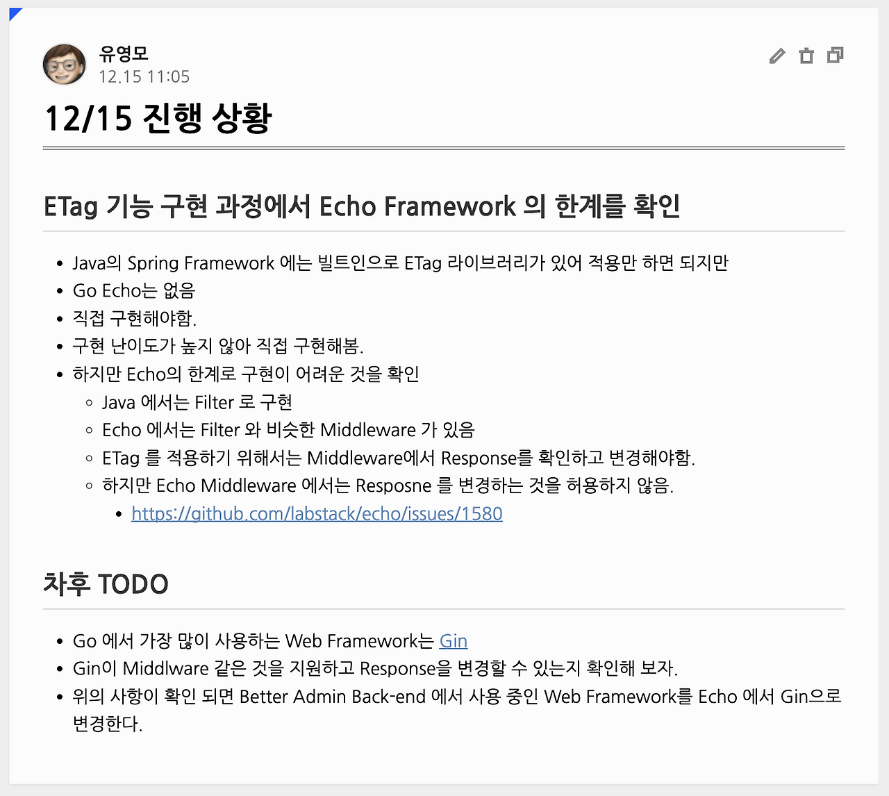 최근에 회사 동료가 Better Admin 이란 제품(소프트웨어)에서 네트워크 성능 개선을 위해 캐시를 적용하는 과정에서 다음과 같은 기록을 공유했다. 그리고 대면 회의에서 그가 Gin 도입을 결정하기 위해 검증 작업을 해보기 전에는 Spring 경험이 프레임워크에 대한 자신의 인식을 제한했다고 말했다.