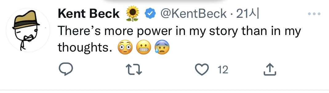 언젠가 보관했던 Kent Beck의 글도 찾았습니다. 그는 사고보다는 자신의 이야기가 힘을 갖는다고 말했다.