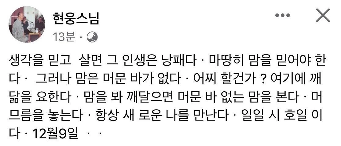 생각을 멈추고 전에 보관해 둔 현웅스님의 글을 찾았습니다. 생각보다는 마음을 믿는 훈련이 될 듯합니다.