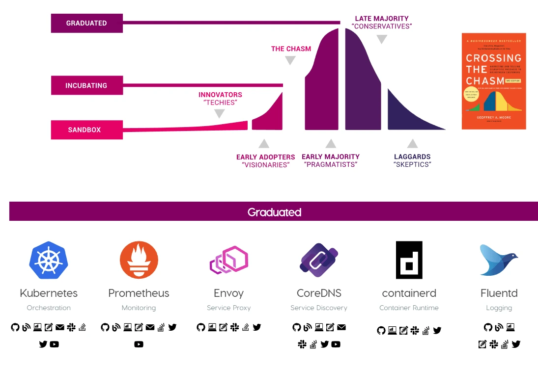 마지막으로 눈에 띄는 내용은 CNCF가 하위 프로젝트(단위 기술과 그 개발 공정을 동시에 뜻함)의 기술 성숙도를 관리하는 체계다. 이미 아파치 재단에 익숙한 분들은 거의 유사하다는 사실을 눈치챌 것이다. 인프라 사용자(소프트웨어 개발 조직이나 개발자) 입장에서 선택을 쉽게 해 주겠다는 의도다.[1]