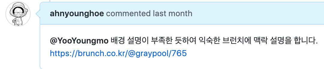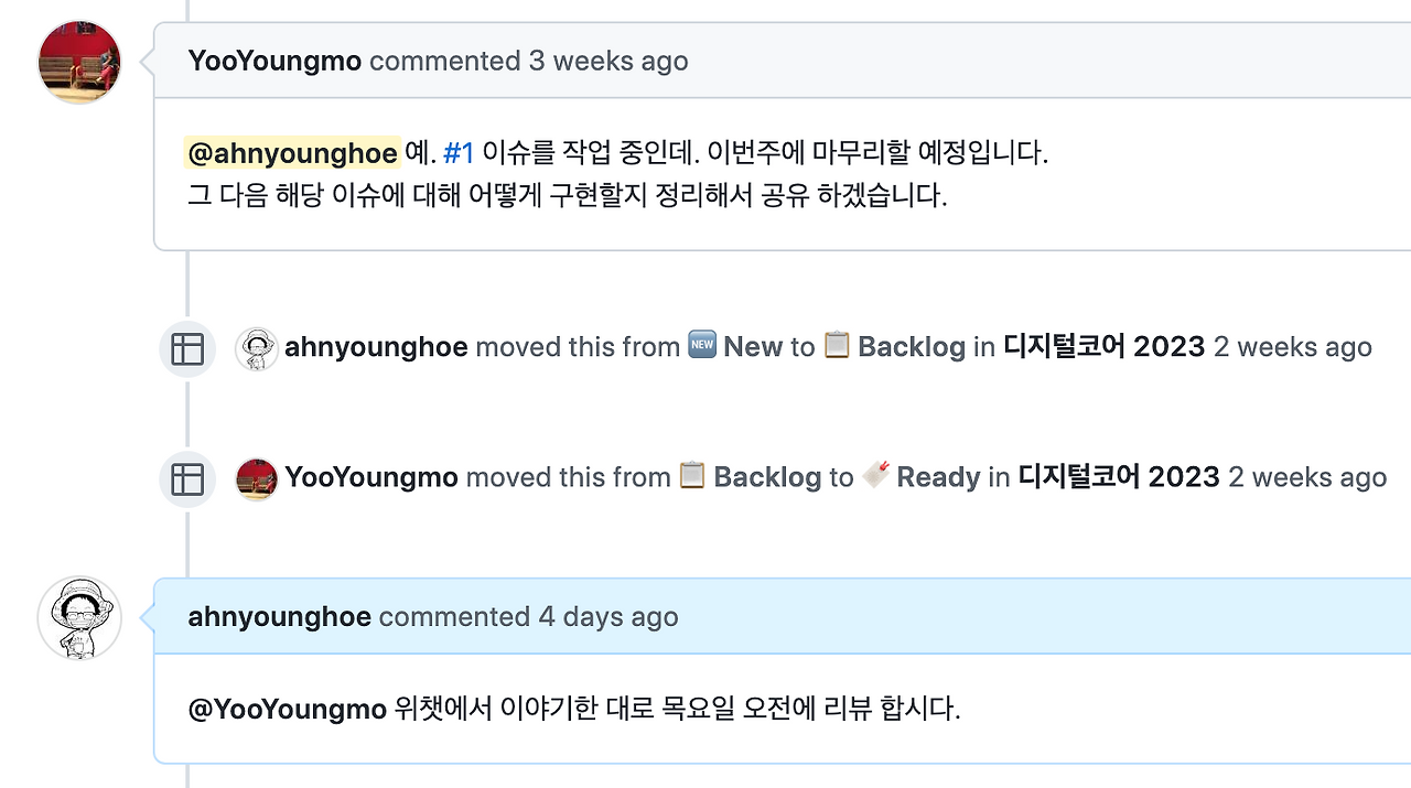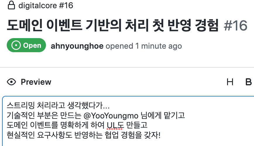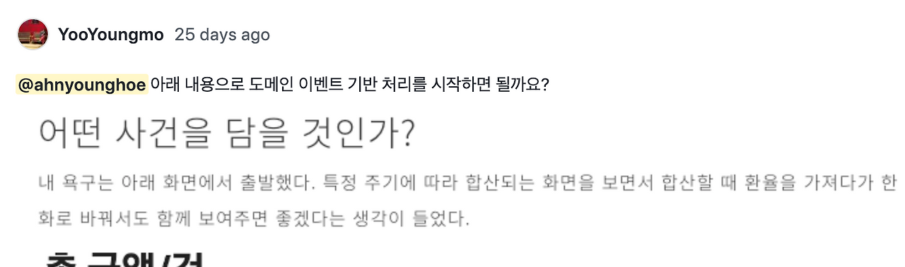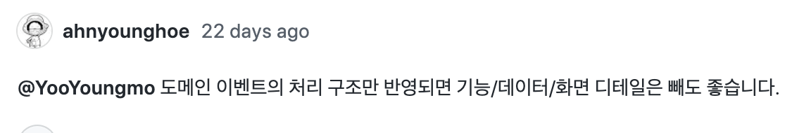 개발 우선순위 조정과 범위 변경은 깃허브 이슈에서 대화로 진행되었다. 먼저 <도메인 이벤트 정의하기>편을 동료에게 읽어 보라고 조언했다.