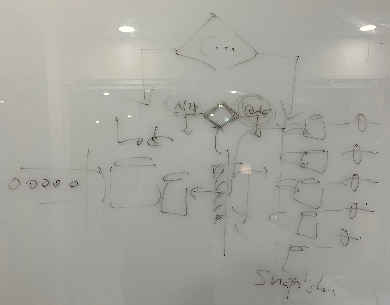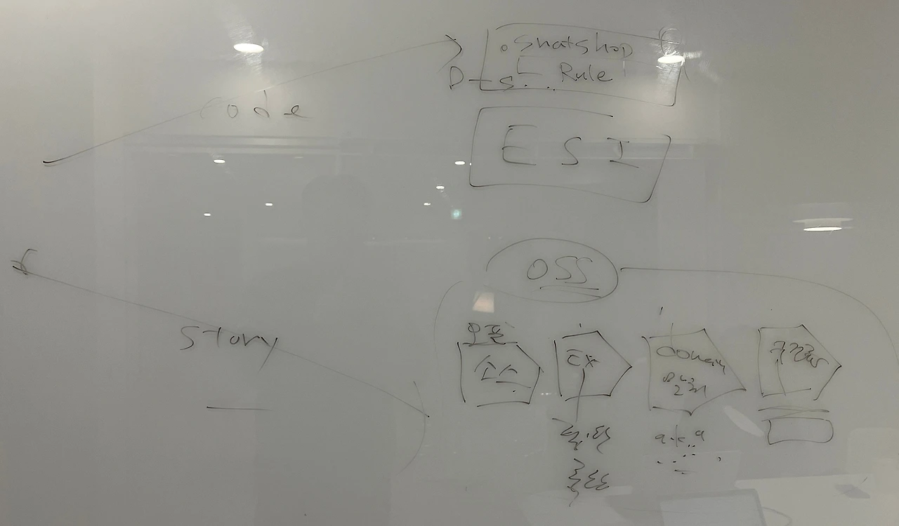 또 다른 이점인 다자 교류의 흔적이 칠판에 남았다. 도메인 스토리텔링을 하는 다른 동료는 개발자 출신이 아니라 기술 구조에 대한 이야기를 이해하는데 어려움이 있었다. 하지만, 그는 논리적 사고가 가능해서 어느 정도 이해하고 싶어 했다. 다만, 기술을 좋아하는 탓에 영감을 받아서 넘겨짚고 마음대로 이해하는 내용 속에 비약이 많았다. 나는 지나치다 싶은 부분에서 일어나서 그림을 하나 그렸다.