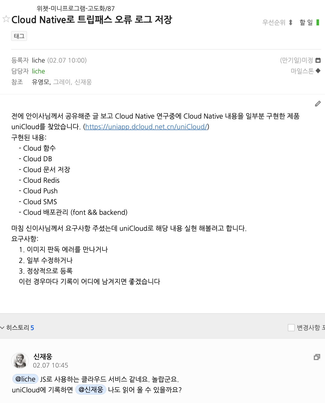 방금 전에 두레이에서 중국인 개발자 동료가 업무에 대한 셀프 제안을 했다. 반가움과 놀라움이 교차했다.