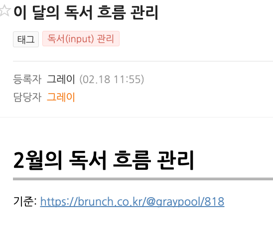 한편, 눈에 잘 띄지 않는 중요한 노하우가 하나 있습니다. 제가 새로운 업무에 태그를 독서(input) 관리라고 붙였습니다. 기존에 글쓰기 프로젝트에 새로 들어갈 활동을 반영하여 균형 잡힌 공동체(?)가 되도록 필요하면 프로젝트 성격이나 이름을 바꿔야 할 수도 있고, 그렇지 않더라도 다른 일과의 관계를 교통 정리해야 합니다. 조직화 문제라고 일반화할 수도 있는데 OKR을 다년간 쓰면서 생긴 정렬 습관으로 볼 수도 있습니다.