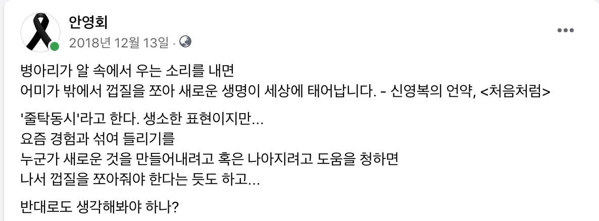 전에 썼던 <좋은 후원자가 되는 법 활용>이 떠오른다. 사자성어가 있는 듯하여 찾아보니 '줄탁동시’(줄啄同時)'였다. 놀랍게도 북경에 있을 때, 신영복 선생님의 글을 읽으며 배운 말이다.