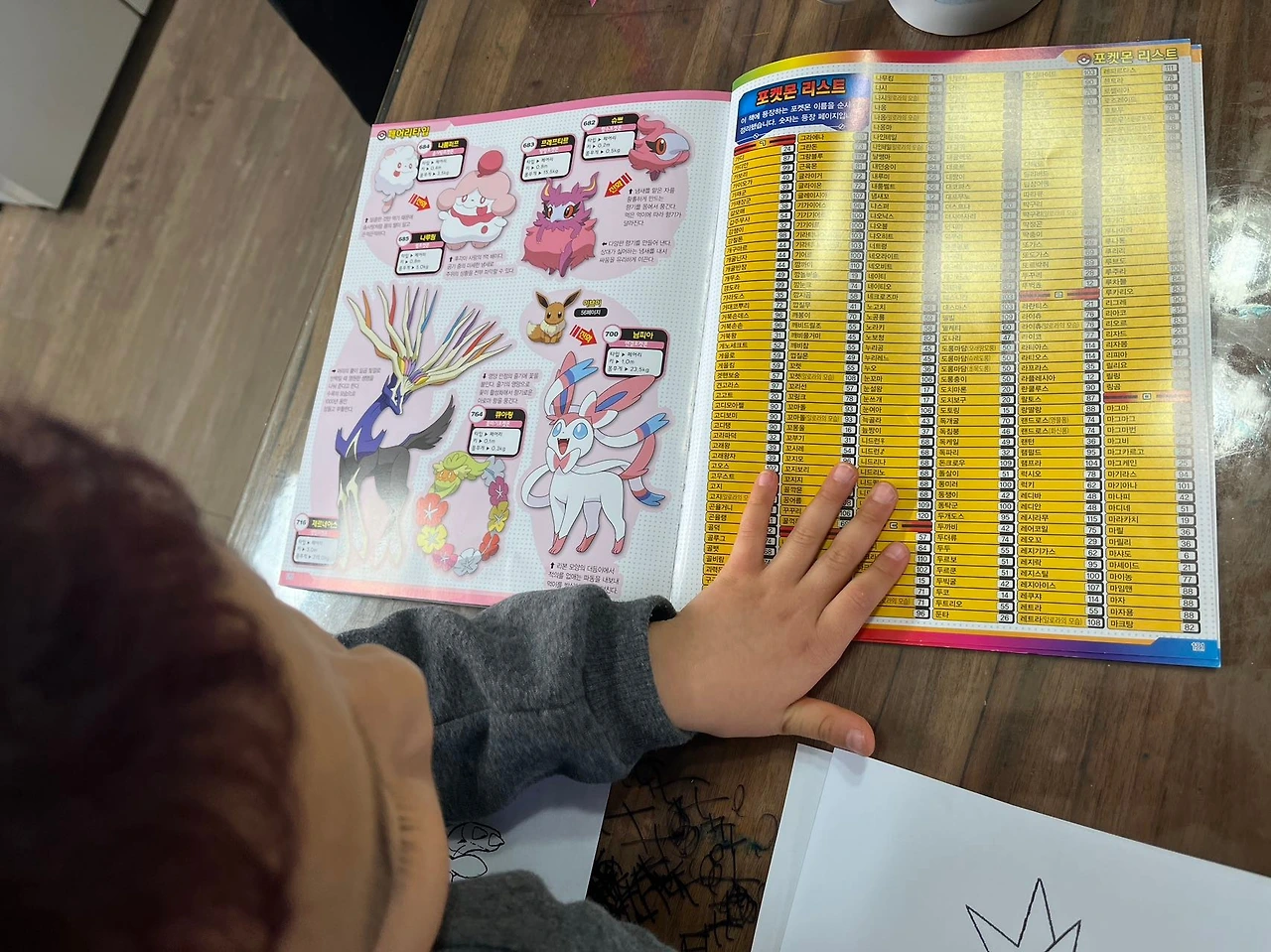 둘째는 포켓몬으로 한글 읽고 쓰기의 상당 부분을 배우는 듯합니다. 자기가 원하는 도감을 보기 위해 차례에서 나오지 않으면 색인에서 찾는 법을 알려 주었습니다. 이제 막 스스로 글을 익히는 아이에게 빽빽한 글자는 버거울 듯하지만, 본인이 동기가 분명하니 종종 스스로도 찾아보는 모습입니다.