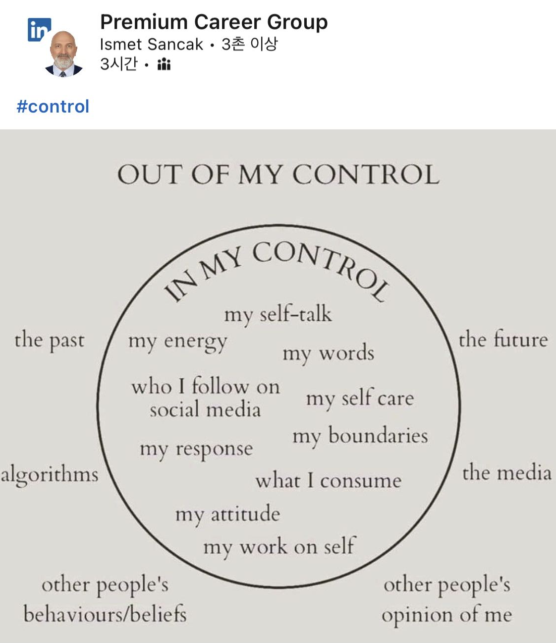 상대가 있거나 협업을 할 때에도 상대나 동료에 대해 판단하기보다는 목표에 집중하는 것이 중요하고 생각합니다. 인용한 그림의 이분법을 이용하여 표현하면 통제할 수 있는(in my control) 내 일(my work on self)에 집중하고 주변의 평가(other people's opinion of me)나 동료의 행위 등(other people's behaviors/beliefs)은 마음에 담아 두지 않습니다. 왜냐하면, 내 통제 범위가 아니니까요(Out of my control).
