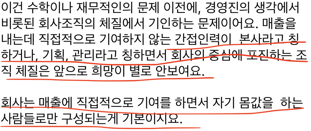 회사는 매출에 직접적으로 기여를 하면서 자기 몸값을 하는 사람들로만 구성되는 게 기본이지요.