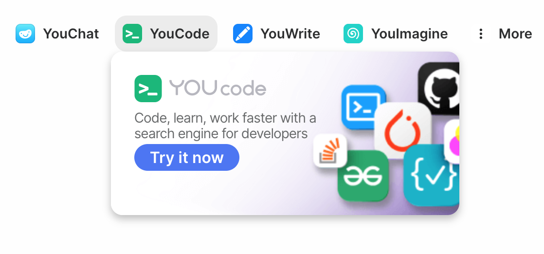 기사 뒷부분은 AI 서비스를 소개합니다. You.com 첫 페이지 좌측 상단에는 AI 기능으로 보이는 네 개의 메뉴가 나타납니다.