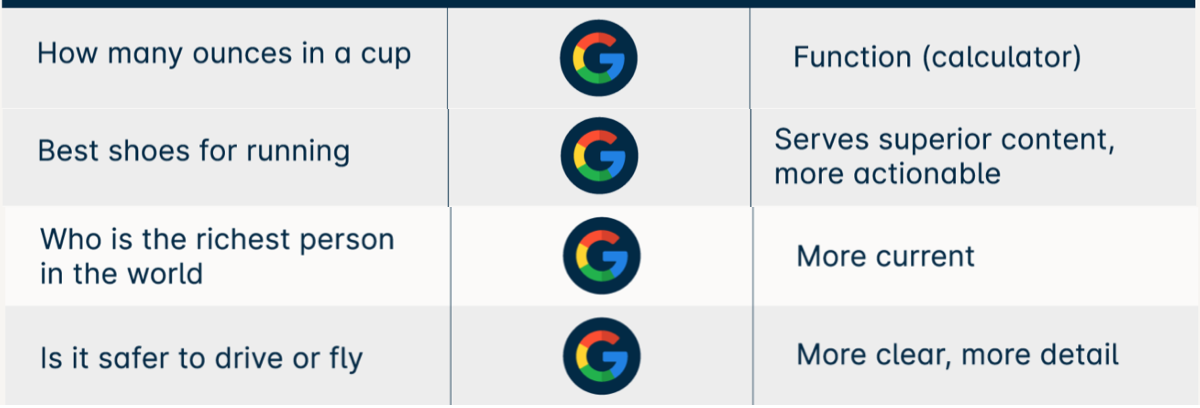 기능이 필요한 경우나 최신 데이터를 찾거나 상세한 정보나 명확한 정보, 특히 행동에 바로 써먹을 수 있는 내용들은 구글이 우수했습니다. 쇼핑이나 음식 선택 같은 것들은 왜 구글이 더 나은지 이커머스를 쓰는 분들은 쉽게 짐작하실 수 있지 않을까 싶습니다.