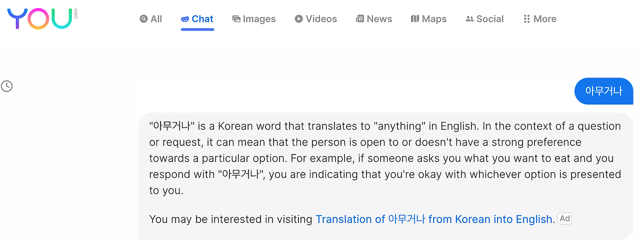 일단 '아무거나' 쳐 봤습니다. ChatGPT 스러운 UI가 가장 눈에 띕니다. 그리고 생존(?)을 위해 ad가 가장 먼저 뜨도록 사업 모델(Business Model)을 구현해 놓은 부분이 눈에 들어옵니다.