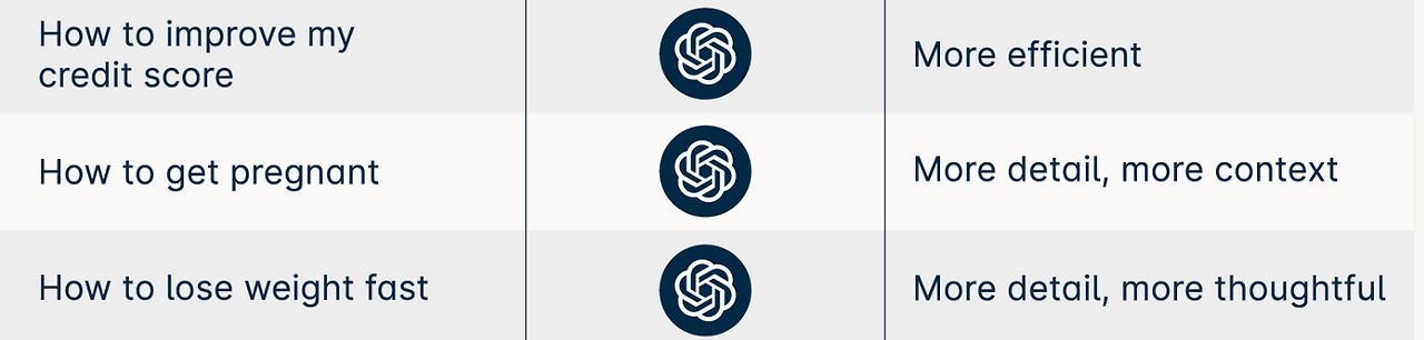 반면에 ChatGPT가 이기는 패턴은 다음 세 가지로 압축할 수 있었습니다. 효율적이다. 그렇죠? 여러 페이지를 누를 필요도 없죠. 사실은 누를 수도 없습니다. :)