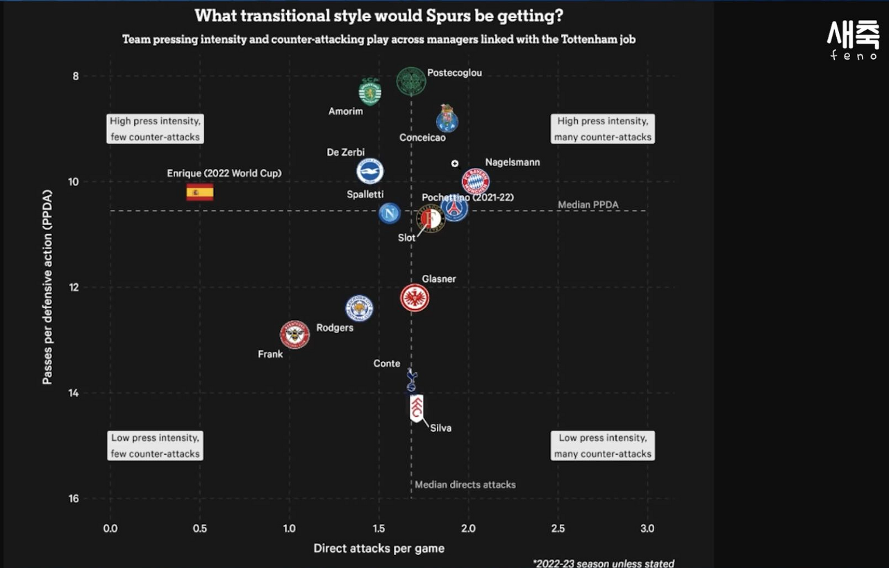 축덕 콘텐츠의 진화는 축구가 산업화되면서 데이터 기술까지 접목하고 있습니다. 앞서 전략 해설가로 소개한 페노의 채널을 보면 토트넘(손흥민이 소속된 축구팀)의 감독으로 연결되고 있는 모든 후보를 두 가지 축으로 비교하는 사분면을 보여 줍니다. 각각을 어떻게 지표 혹은 지수화했는지 궁금하지만 그에 앞서 놀라움을 먼저 느낍니다.