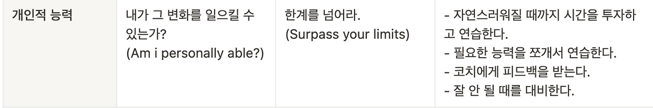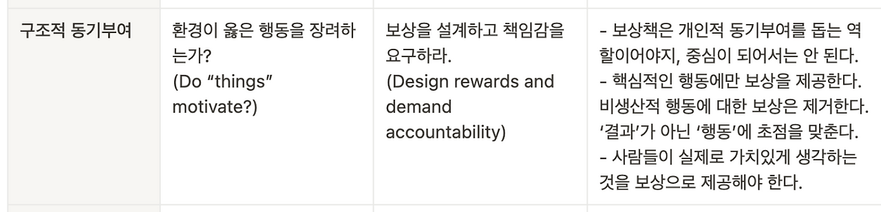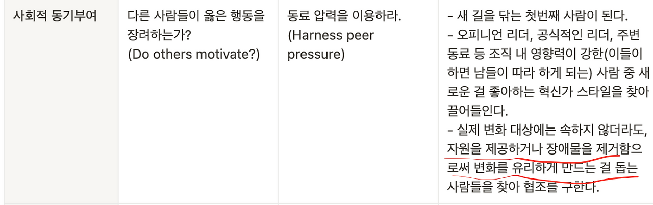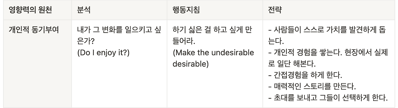여기서 휘동 님의 글은 작업장이나 협의 방식을 다룬 것이 아니라 영향력을 끼치는 방법을 다루고 있습니다. 그리고, 친절하게 영향력을 끼치는 6가지 원천 모델을 요약해 두었습니다. 모델에 대한 설명은 휘동 님의 글을 읽으시고 저는 각 모델을 빠르게 훑어본 이후에 드는 생각을 기록합니다. 첫 번째는 개인적 동기부여입니다.