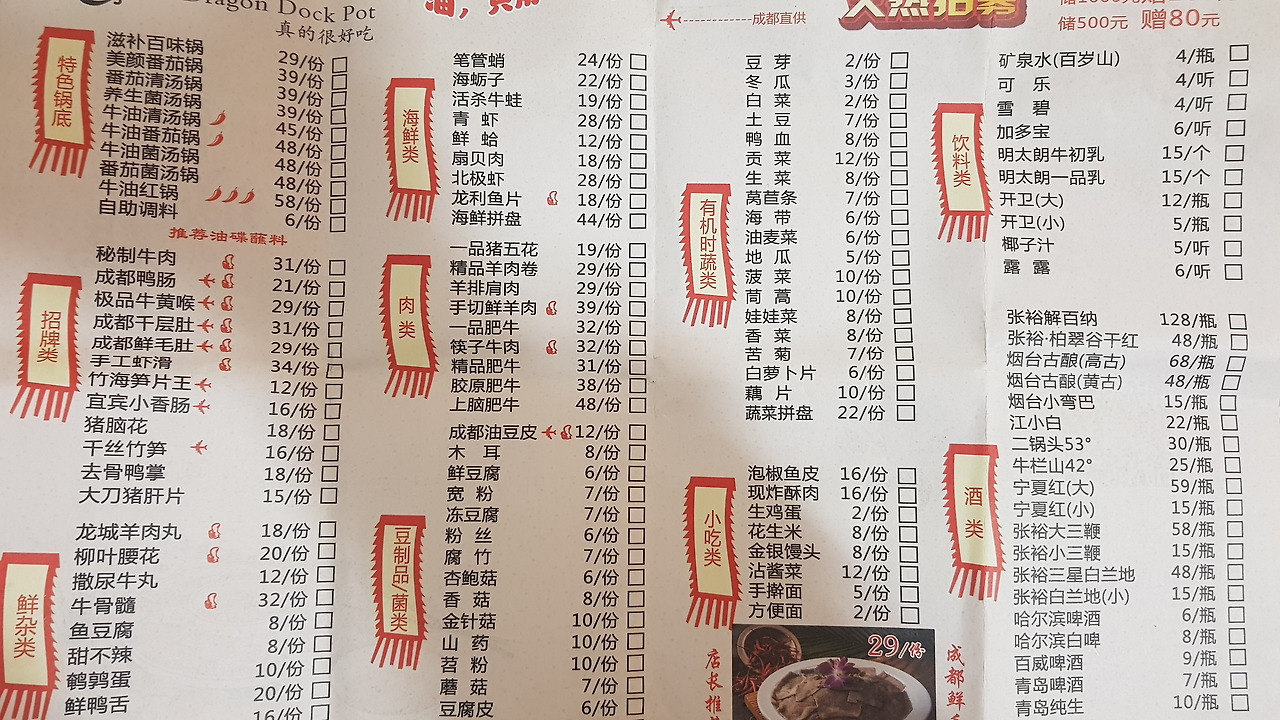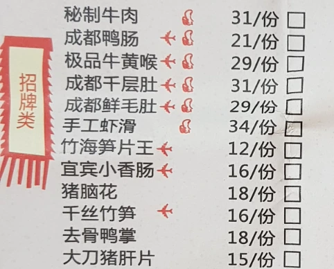식당의 대표 간판 메뉴를 모아두었다. 그래서 인지 추천메뉴를 뜻하는 좋아요 표시가 꽤 많이 붙어있다. 비행기는 쓰촨에서 직접 공급받은 메뉴임을 뜻한다. 어디선가 쓰촨의 닭이나 가축류들의 품질이 아주 좋고 비싸다는 것을 들은 적이 있는데 그래서 표시해 놓은듯 싶다. 이쪽 메뉴는 식당 간판 메뉴이니 다른 식당에서는 팔지 않는 것들이 있을 수도 있겠다.