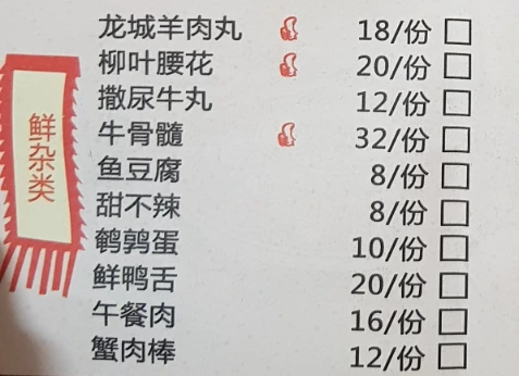 여기서 내가 주로 시키는 메뉴는 색을 칠해놨다. 사실 중국 사람들은 내장류를 많이 즐겨먹는 듯 하지만, 익숙하지 않은 나는 언제나 안전한 메뉴를 고르게 된다.