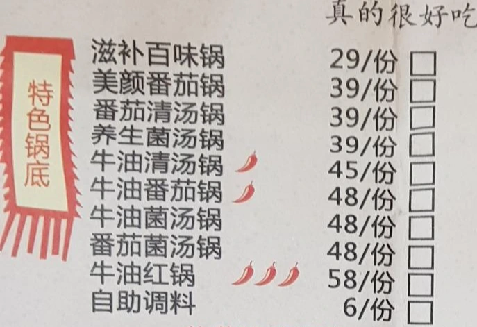 自动调料 (zìdòngtiáoliào) : 직역하면 자기 스스로 양념을 한다는 뜻인데, 아마도 기본 육수(혹은 물)만 주고, 재료를 넣어가며 육수를 만들어 먹는 것을 일컫는게 아닐까 추측해 본다.