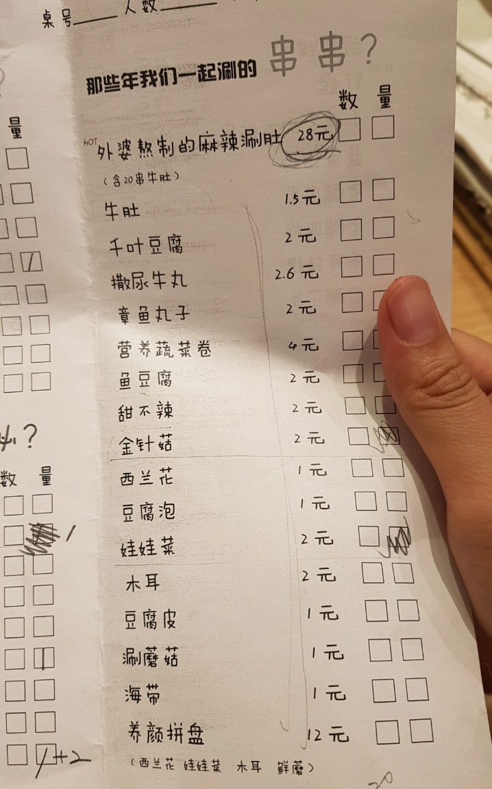 外婆熬制的麻辣涮肚 (wàipóáozhìdemálàshuàndù) : 외할머니(外婆)가 푹 고은(熬制) 마라탕을 의미한다. 외할머니가 주는 특유의 포근한 어감이 있나 보다. 중국의 유명한 외식 프랜차이즈 중에서 '외할머니 집(外婆家)'이란 곳도 있다. 이 탕을 기본으로 시키고, 아래에 촨촨샹 샤브샤브를 해먹을 꼬치들을 고르면 된다.
