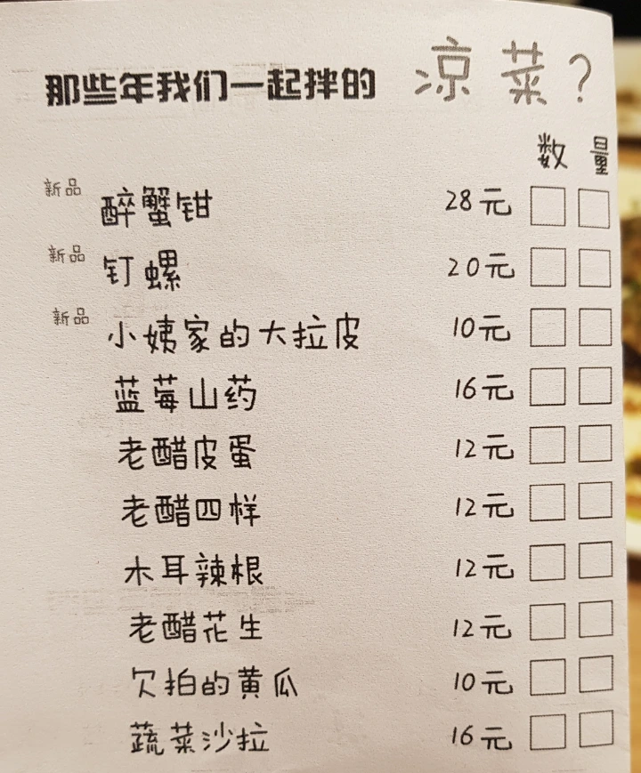 꼬치 메뉴와 곁들여 먹을 반찬 메뉴이다. 보통 뜨거운 것들은 요리로 분류되기에, 凉菜(량차이) 라고 하면 곁들여 먹는 야채 반찬이 주이다.
