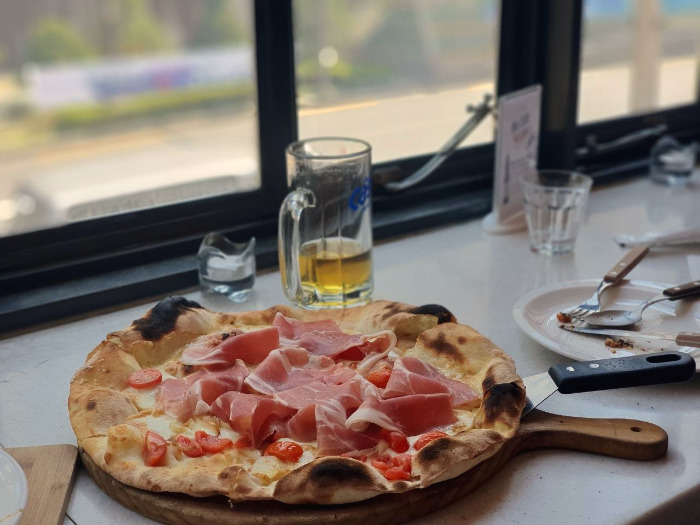프로슈토가 잔뜩 들어간 이 피자가 나왔을 때, 와인도 한 잔 마시고 싶은 충동이 들었던 것 같아. 근데 끝나고 에세이 쓰러 가야 했으니까, 한잔으로 족하기.