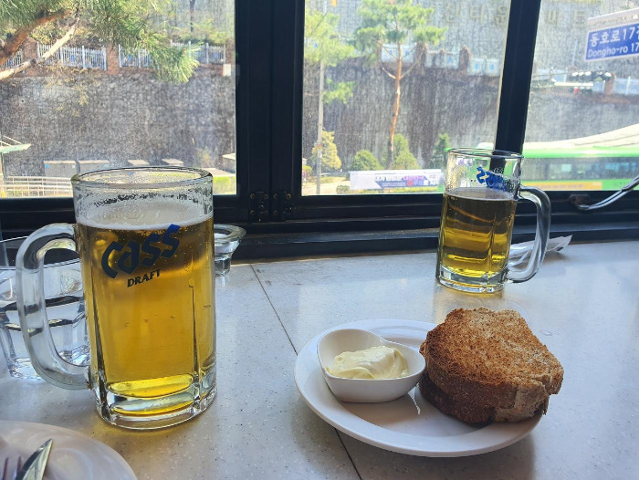 아주 잠시 와인을 마실까 고민했지만 생맥주를 시키고 말았어. 프렌치나 이탈리안 음식을 먹을 때면 와인을 곁들이는 게 더 어울리나 싶지만, 대낮에는 아무래도 맥주가 끌리더라고. 시원하게 한잔 들이켜고 싶어서 파리 여행 마지막 식당에서도 고민 끝에 맥주를 시켰었지.
