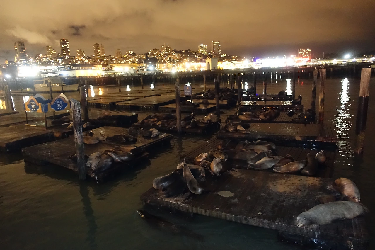 레스토랑을 나와보니 밤하늘을 울리는 엉!엉! 소리가 들려왔다. 그 소리를 따라 걸으니 바다 사자들이 놀고 있었다. 늦은 시간에도 서로 장난치며 노는 바다사자들. 특이한 울음소리를 듣다보면 마치 중견 개가 짖는 소리와 비슷하기도 하다.
