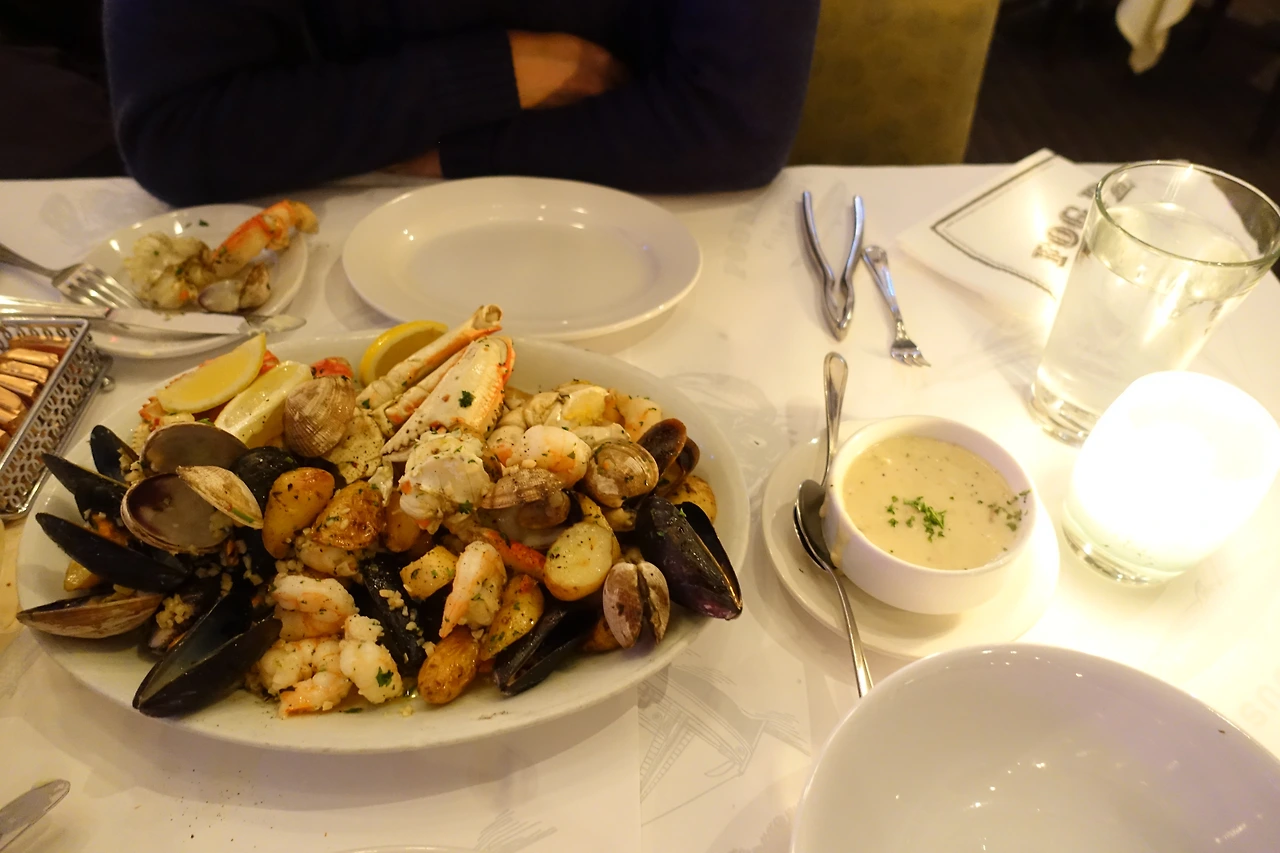 저녁을 먹은 곳은 Fog Harbor Fish House라는 해산물 주종 식당이었다. Dungeness Crab(털게)가 들어간 Shellfish Platter와 Clam Chowder Soup를 주문했다. (+캘리포니아 생맥주도 추가!)