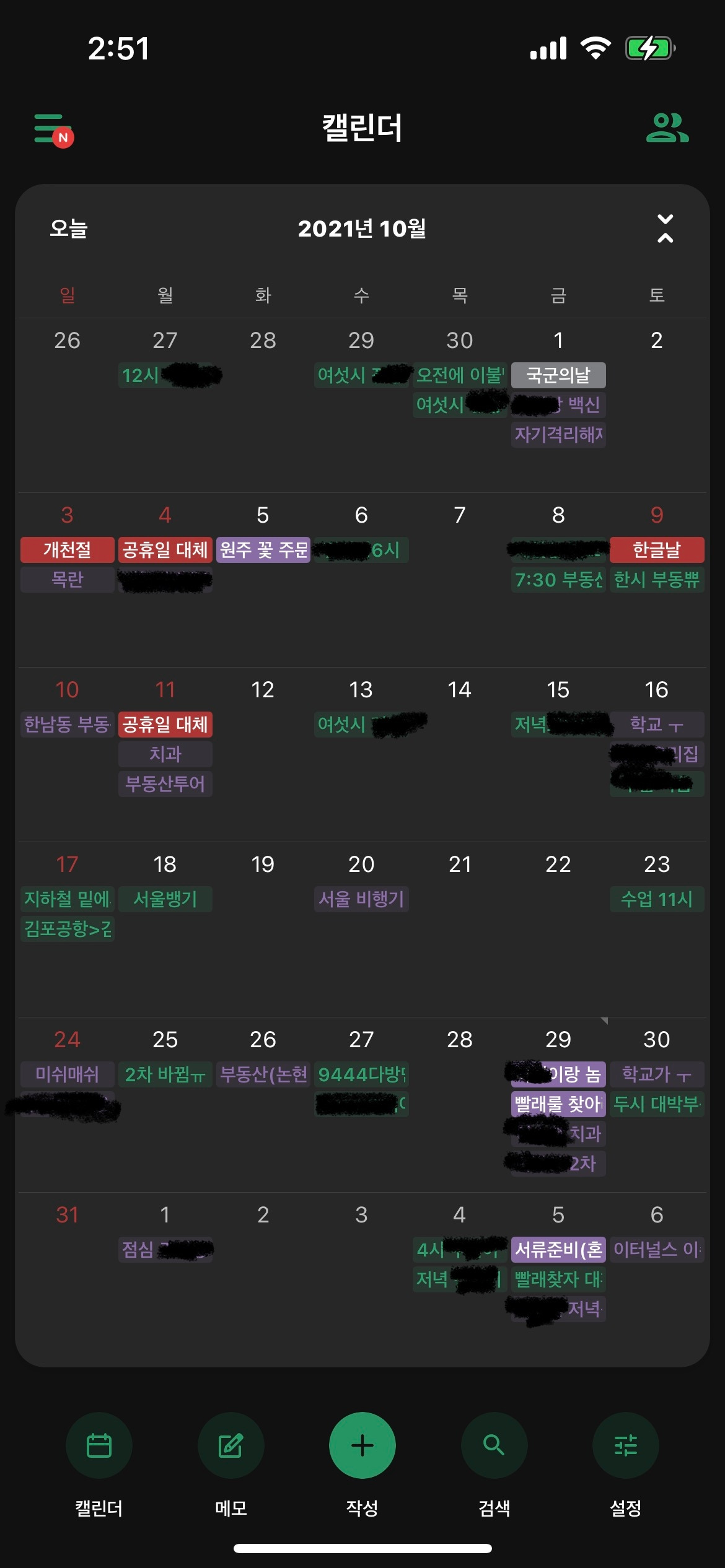 색상으로 누가 등록한 일정인지 확인 가능(보라:나/초록:남편)