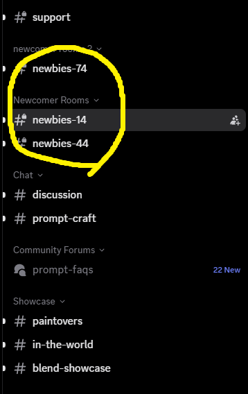 1. 디스코드의 미드저니 서버에 입장하면 왼쪽 메뉴에서 #newbies로 시작하는 채널을 찾는다.