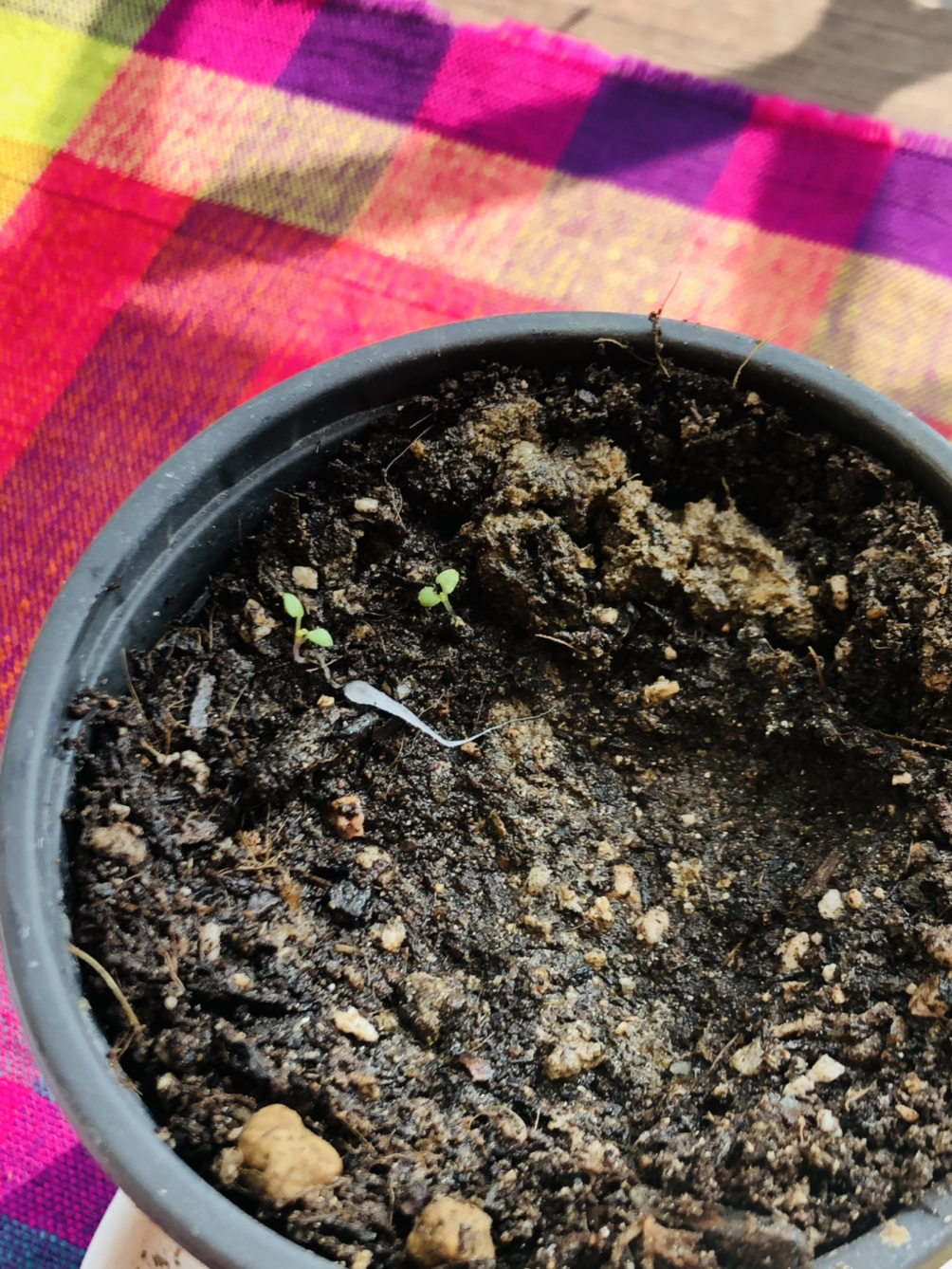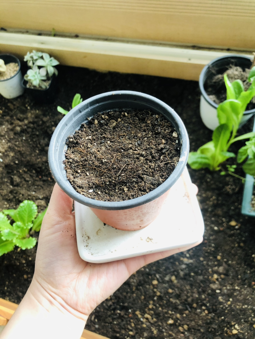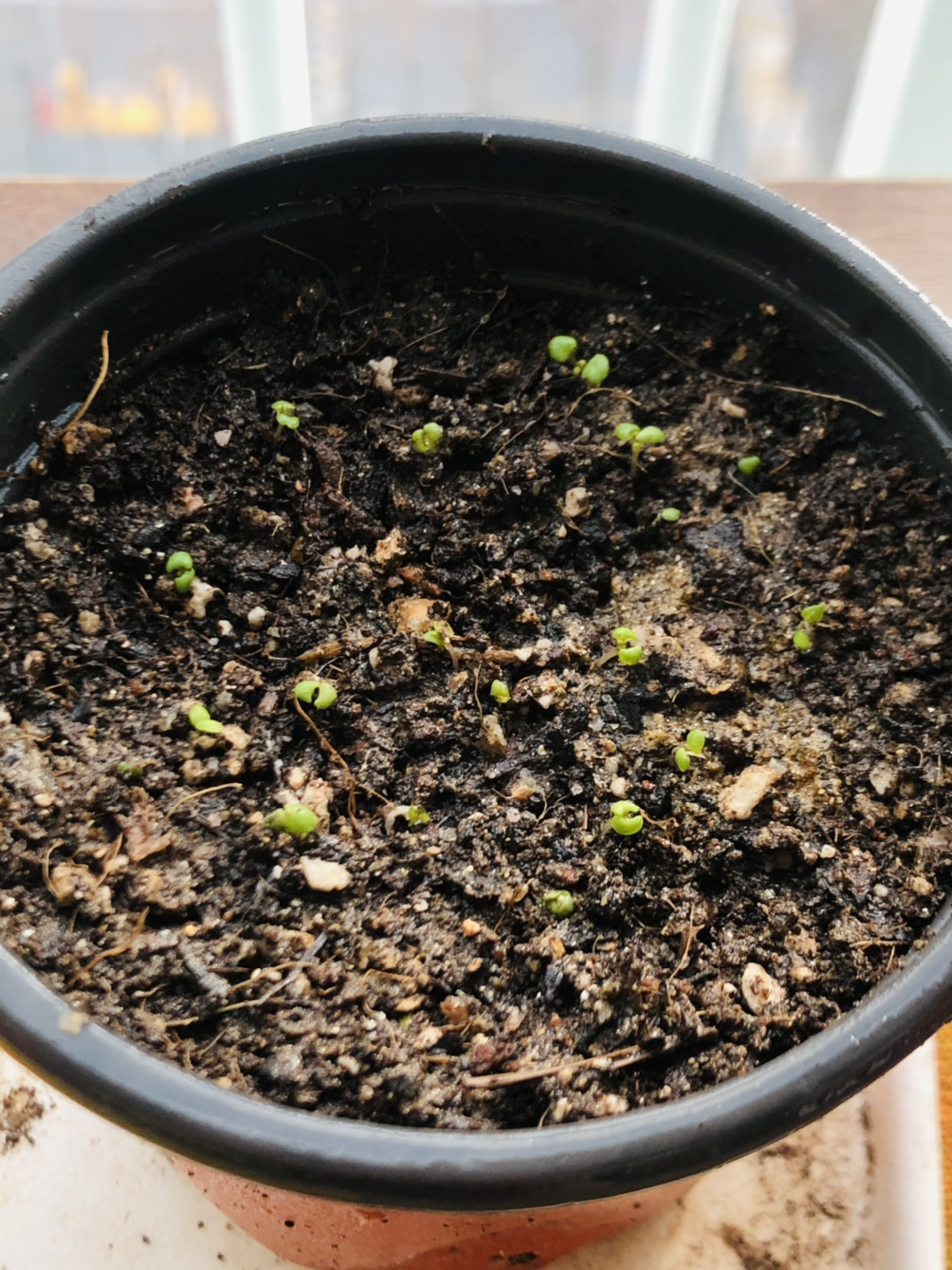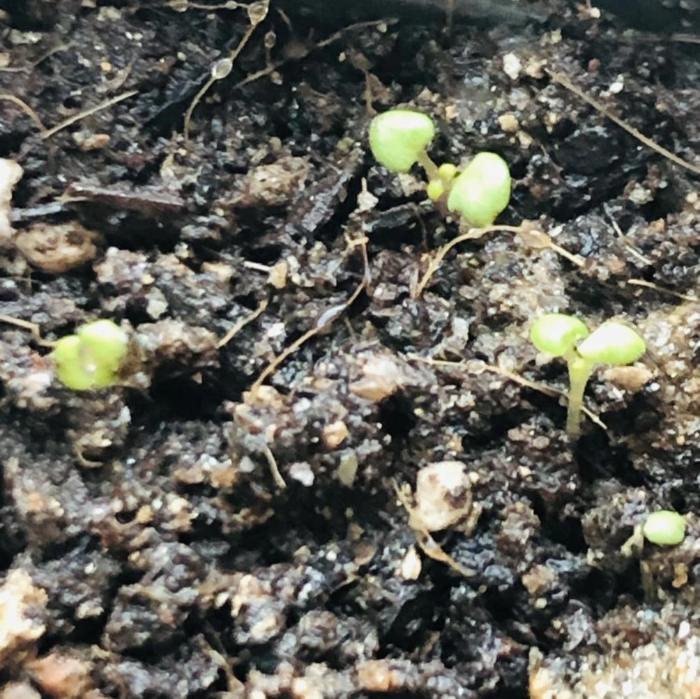 베란다에 남는 화분 하나를 집어서 엄마의 화단에서 무단으로 흙을 퍼담았다. 그러고 나서 핀셋으로 하나하나씩 새싹들을 옮겨주는 작업을 시작했다. (허브 키우시는 분들이 본다면 뒷목을 잡으실 수도...) 어떤 건 솜에 뿌리를 꽉 내리고 있어서 옮기다가 뿌리가 잘린 것도 있고, 두 개밖에 없는 잎을 하나씩 뜯어먹은 것들이 속출하기 시작했다. 매우 어설펐던 나의 첫 분갈이는 모든 새싹들을 화분에 옮겨 담자마자 스르륵 마르기 시작하더니 이내 흙으로 사라지면서 끝이 났다. (눈물)