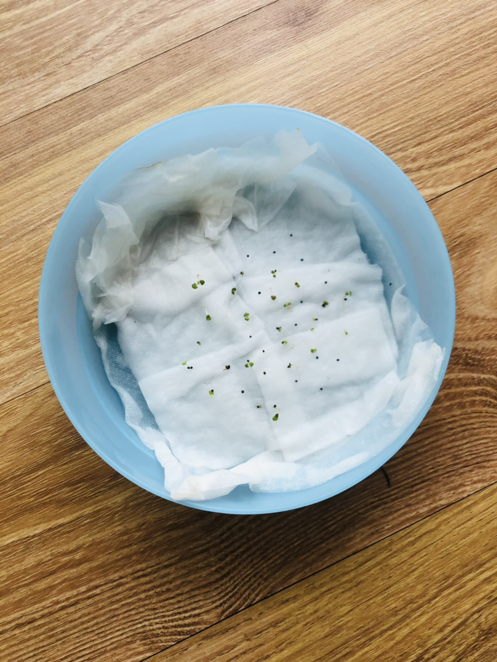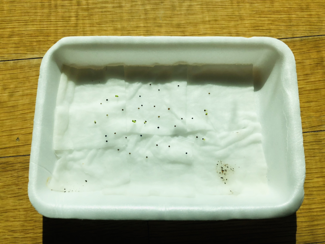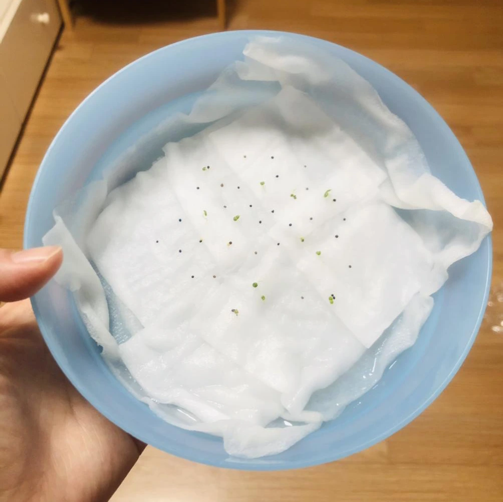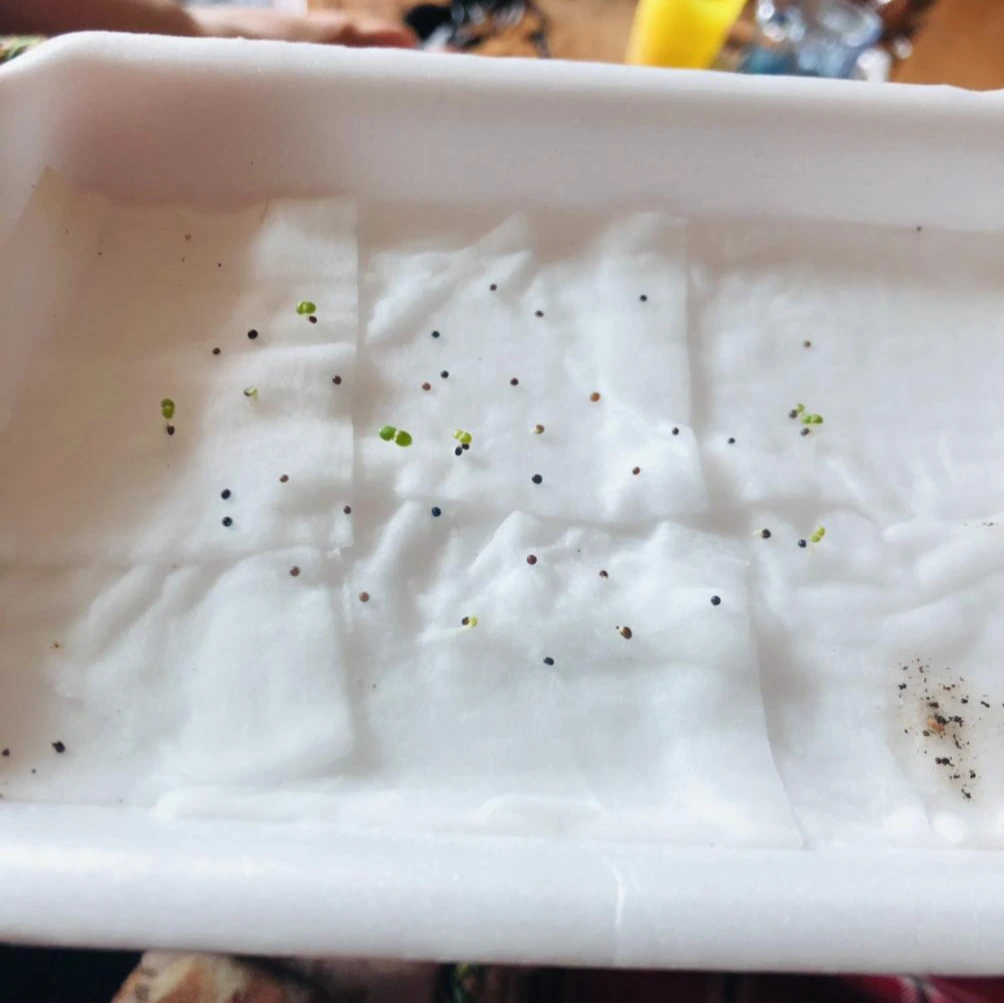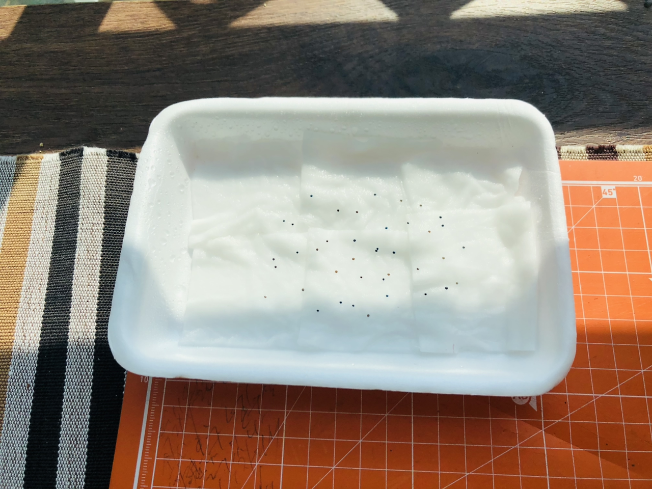 신나서 택배를 뜯고 나서 씨앗을 딱 보았는데 기쁨도 잠시 생각해보니 어디에 심을지 생각도 안 해보고 무작정 구매했다는 생각이 들었다. 판매 사이트를 보니 작은 모종 포트나 지피 펠렛이라는 씨앗 파종용 흙에다가 한다고 하던데 알았으면 함께 주문할 텐데 씨앗만 사는 데 꽂혀서 이후 생각을 하지 않았다. 너무 막막해서 엄마께 SOS 신청을 했더니 날이 추운데 무슨 씨앗을 샀냐며 엄마께 한 번 혼난 후 베란다 화단에다가 한 줄, 혹시 모르니 따뜻한 실내에서 조그맣게 솜 발아도 함께 해보기로 했다. (허브 타임은 내한성이 좋아서 겨울에 베란다 재배도 가능하다고 한다.) 솜 발아는 처음 해보는 거라 인터넷에서 블로그 사진만 보고 비슷하게 따라 했는데 마음 한 편으로는 싹을 틔우는 게 힘들지 않을까 하는 생각도 조금 갖고 있었다. 그냥 자라 있는 화분을 살걸 또 오버했다며 마음만 앞선 나를 탓하며 눈에 보이는 스티로폼에 화장솜을 물에 적셔 깔고 깨알보다 작은 씨앗들을 2~30개 정도 뿌려주고 그 위에 또다시 분무기로 물을 뿌려 주었다.