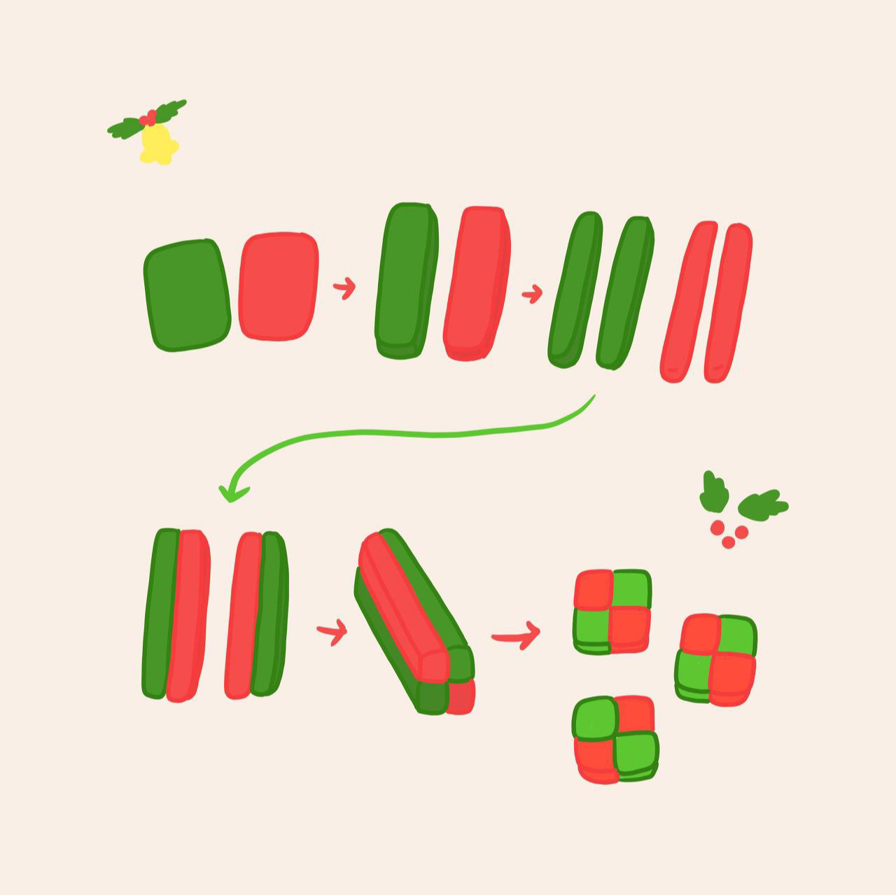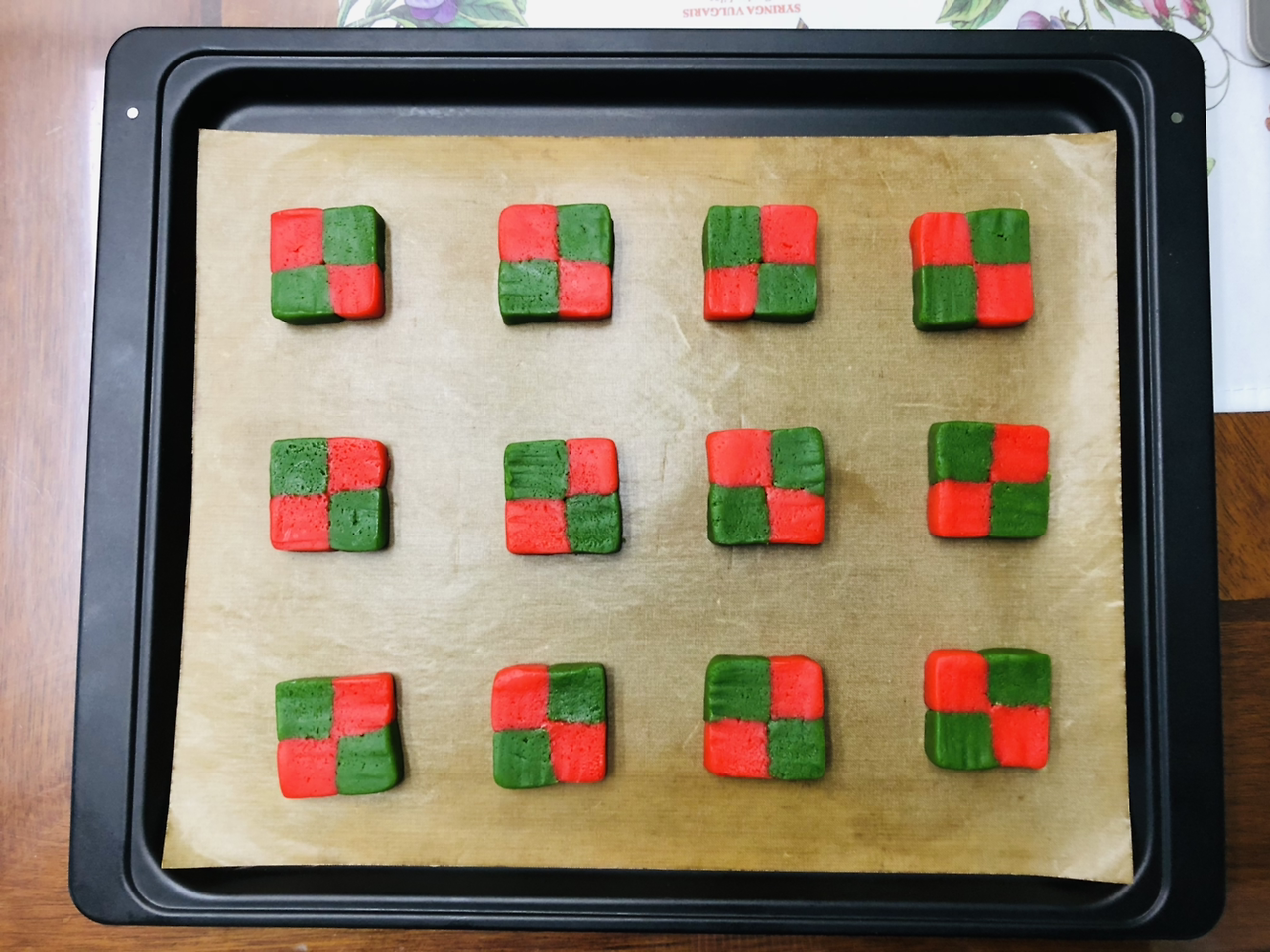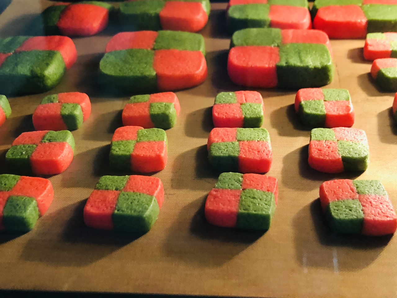 다음 작업이 체크 쿠키의 포인트라 말할 수 있는데 반죽을 꺼내서 초록색, 빨간색 반죽을 세로로 길게 밀고 김밥에 들어가는 단무지처럼 잘라서 다른 색끼리 붙이는 작업이 필요했다. 처음엔 1cm 너비로 만들었는데 너무 작아서 다음 반죽은 너비와 두께를 2cm로 만들었다. 초록색 반죽 한쪽에 계란 흰자를 바른 다음(접착제 역할) 빨간색 반죽을 붙였다. 너무 꾹꾹 누르면 모양이 망가지니 조심스레 다뤄야 했다. 같은 방법으로 하나 더 만든 다음에 이 두 개를 다른 색이 맞닿도록 붙이니 정사각형 모양의 반죽이 완성이 되었다. 이제 자르기 쉽도록 냉장고에서 30분 정도 다시 굳혀주었다.