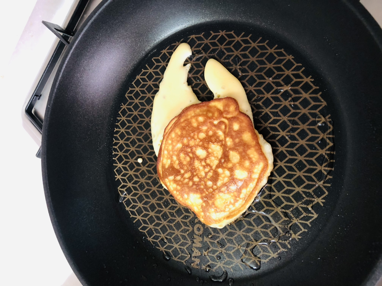 2분이 지나고 이제 뒤집을 차례였다. 뒤집개를 빵과 프라이팬 사이에 넣은 다음에 탁! 하고 잽싸게 뒤집어 줬는데 무슨 호떡처럼 얼룩덜룩하게 구워짐은 물론 타기까지 했다. 일단 뒷면까지 다 구운 다음에 식힘망 위에 유산지를 올려놓고 식혔다. 불이 너무 셌나 싶어서 불을 끄고 프라이팬을 식힌 뒤에 다시 시도하기로 했다. 다음엔 한 국자를 떠서 시간도 적게 하고 뒤집었는데 덜 타기만 하고 여전히 얼룩덜룩했다. 세 번째는 너무 빨리 뒤집었는지 미처 굳지 못한 반죽이 뒤집자마자 프라이팬에서 멀리 날아갔다. 네 번째는 시간을 조금 늘린 다음에 뒤집었더니 색은 고왔으나 쭈굴쭈굴하게 접히면서 역시나 마찬가지로 뒤집다가 반죽이 날아갔다. 반죽을 다 구웠더니 8개가 나왔는데 그중 그~~~ 나마 멀쩡한 건 단 2개뿐이고 (이것도 매우 이상함) 다른 건 눈뜨고 볼 수 없을 정도였다.