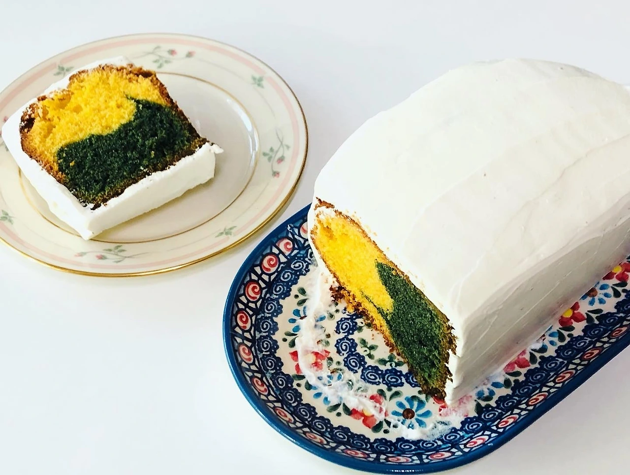 그 후로 몇 년이란 시간이 흐르고 베이킹을 시작하고 난 최근까지도 그 장면을 잊고 있다가 얼마 전 말차-초코 파운드케이크를 보게 되면서 알고리즘이 자연스럽게 리틀 포레스트 st 파운드케이크로 이끌었다. 보자마자 '아! 내가 왜 이걸 기억 못 했지?'라는 생각이 나의 머리를 탁 치고 지나갔다. 몇 년 전의 내가 꼭 먹어보고 싶었던 직사각형의 파운드케이크를 만들어보기로 했다. 시금치와 적미 혹은 흑미로 색을 내긴 힘들 것 같고 레시피 영상이 있는 말차- 초코 파운드케이크를 만들어서 겉에 생크림을 바르는 형식으로 진행을 해보기로 했는데 베이킹 재료 상점에 가니 의외로 말차 가루가 없어서 대신 초록색을 낼 수 있는 쑥 가루를 사 왔다. 그리고 옆에 쑥이랑 어울릴 것 같은 노란색 단호박 가루도 있었는데 가격이 좀 나가서 살까 말까 고민을 했다가 결국 그 날은 못 사고 어제 1호 케이크 상자를 사러 갔다가 단호박 가루도 함께 데려왔다. 주인공과 주인공 엄마가 만든 것을 섞은 것 같은 전혀 예상하지 못했던 조합의 초록색 쑥 & 노란색 단호박 파운드케이크가 되었다.