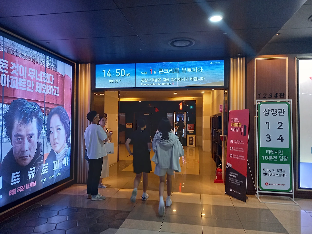 그래서 최근 재미있다는 평을 바탕으로 흥행 중인 한국영화, <콘크리트 유토피아>를 보기로 했다. 이 영화도 좌석이 가득 찼는데, 누가 취소했는지 좋은 뒤쪽 좌석이 한 두 자리가 있어 오후 시간대에 예매할 수 있었다.
